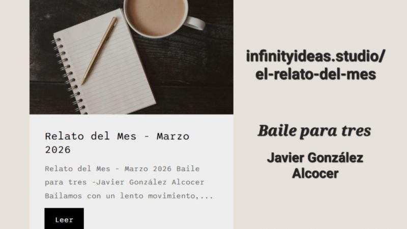 Baile para tres https://javiergonzalezalcocer.es/astuptys/2026/03/Foto-Relato-del-mes.jpg 1004 669 Javier González Alcocer https://secure.gravatar.com/avatar/b8ee28939e2fe9c22e80455ccd0b1e33a7201060f5a09d05d7d387d197fcd617?s=96&d=mm&r=gMi relato Baile para tres ha sido seleccionado como Relato del mes de marzo por la editorial infinity_ideas_studio BAILE PARA TRES, Javier González…